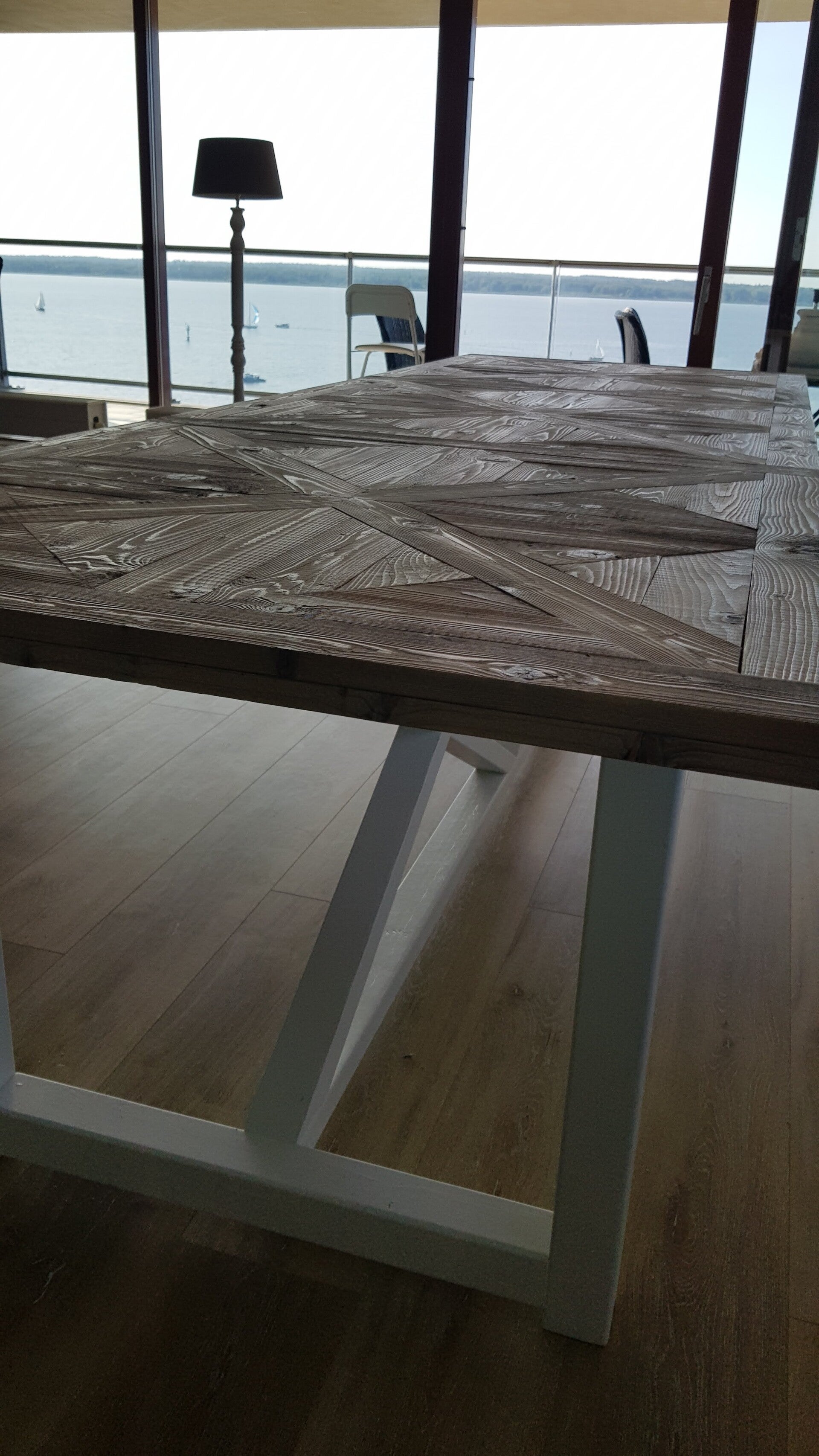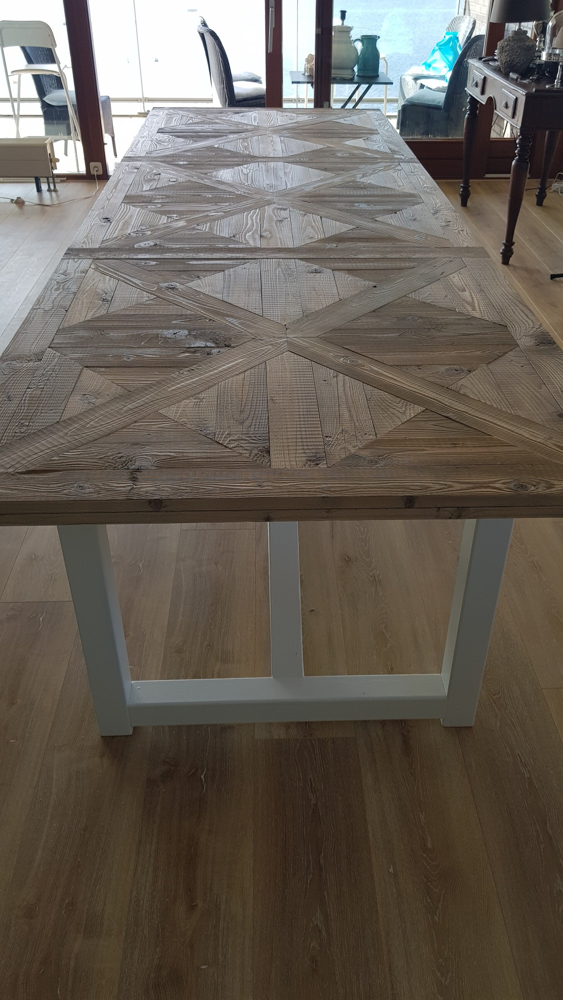 - Driftwood geborsteld blad met geleefde uitstraling in kasteelvloer motief. Het blad heeft een overlap van minimaal 20 cm aan de kopse zijden voor extra zitplekken. Het tafelblad wordt voorzien van een dubbele hardwax beschermlaag waardoor het met een licht vochtige doek afneembaar is.